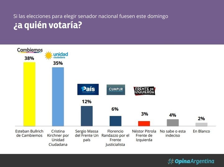 Tras el ajetreo de las PASO, estiradas por la polémica con el escrutinio en Provincia, aún no arrancó la campaña formal de cara a la elección general del 22 de octubre. Pero no hizo falta. La guerra de encuestas sí empezó. Y Clarín accedió a cuatro nuevos sondeos, que confirman la polarización entre Cambiemos y Unidad Ciudadana y mantienen la idea de paridad: muestran diferencias de entre 2 y 4 puntos entre Esteban Bullrich y Cristina Kirchner, cabezas de lista para senadores de las dos principales fuerzas.