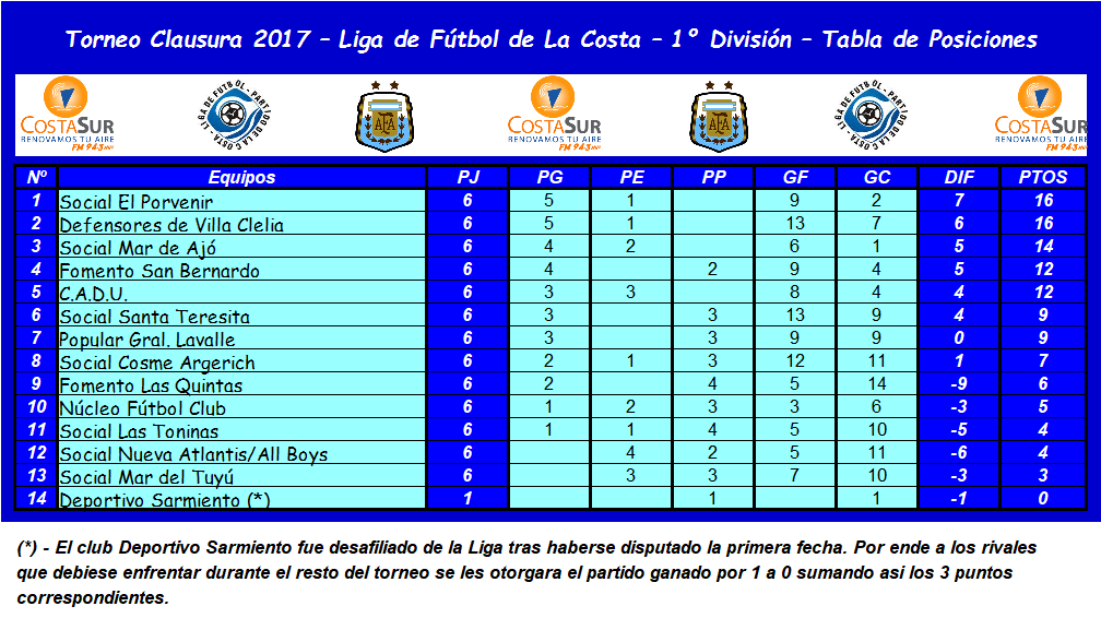 Se jugo una nueva fecha del Torneo Clausura 2017 del Fútbol Grande del Partido de La Costa y los lideres del certamen siguen siendo El Povenir de San Clemente y el Defensores de Villa Clelia que no pudieron vencer a sus rivales de turno, el Social Mar del Tuyú y el Social Nueva Atlantis/All Boys empatando en ambos casos.