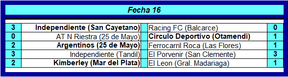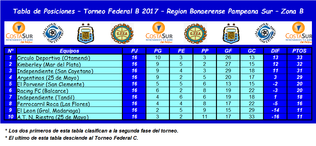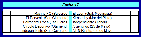 El viernes Atl. Norb. de la Riestra y El León de Gral. Madariaga, equipos que transitan por el fondo de la tabla de la Zona B de la Región Bonaerense Pampeana Sur no pudieron sumar puntos y cayeron en sus compromisos ante Circulo Deportivo de Otamendi y Kimberley de Mar del Plata respectivamente. Gracias a estos resultados El Porvenir de San Clemente sin jugar logró la permanencia ya que la diferencia en puntos era inalcanzable para estos dos equipos.