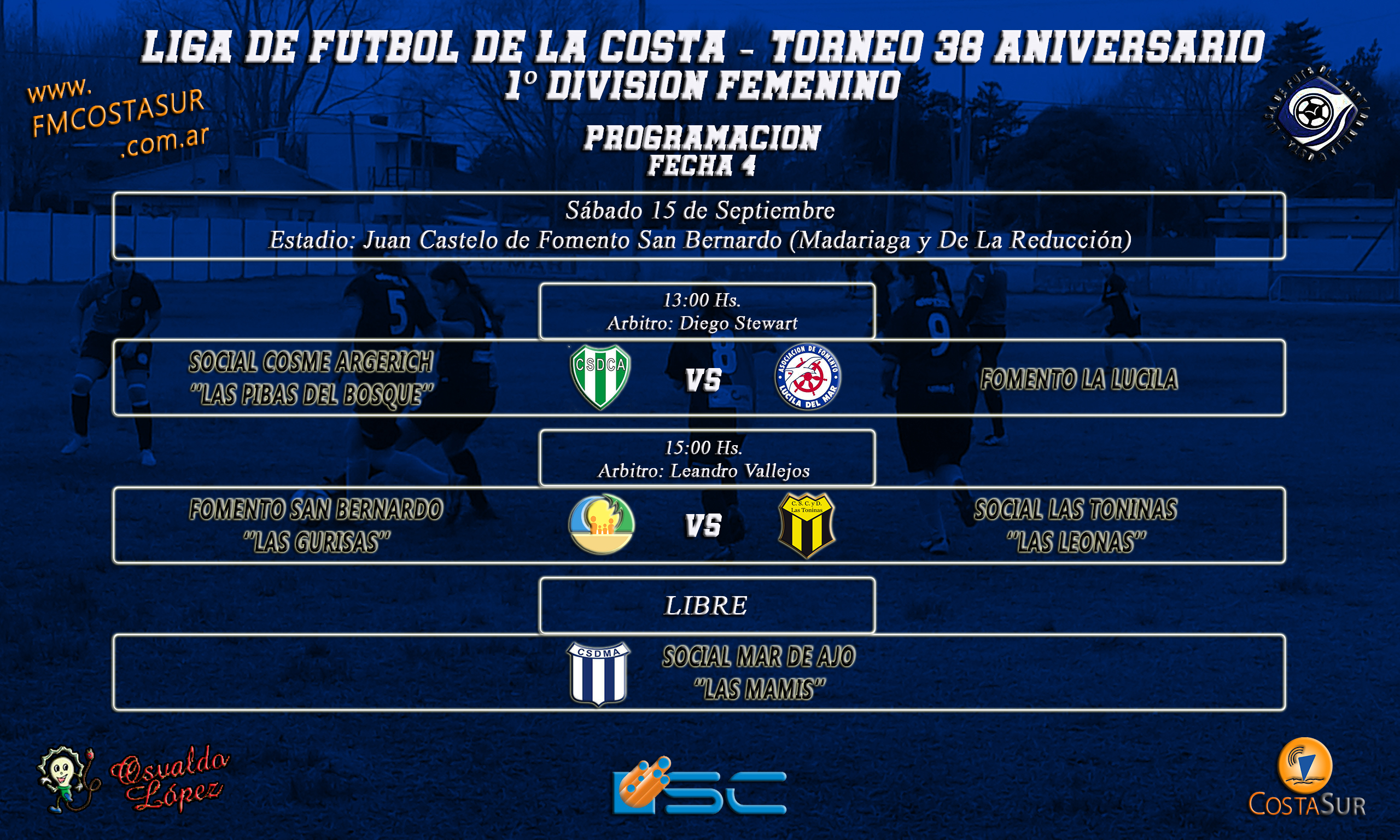 Se juega la cuarta fecha del Torneo 38 Aniversario del Fútbol femenino de la Liga de La Costa en donde el conjunto de La Lucila tiene la gran chance de consagrarse campeón si es que vence a »Las Pibas del Bosque» del Cosme Argerich.